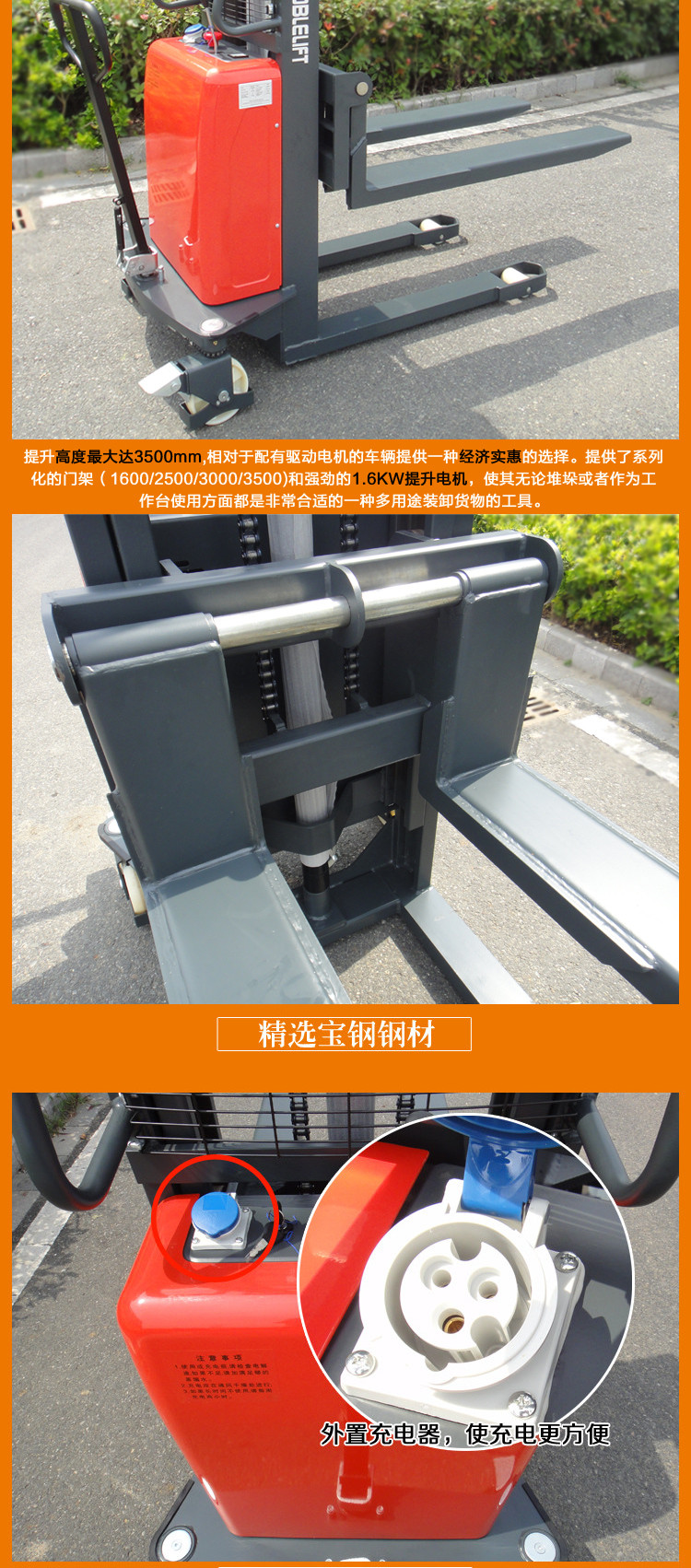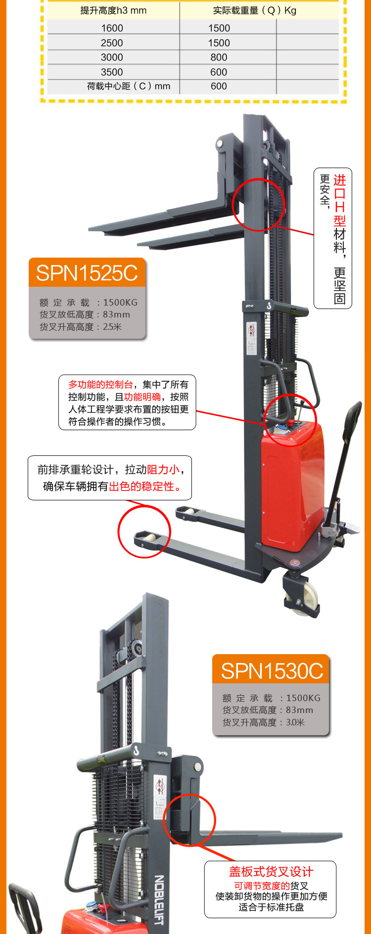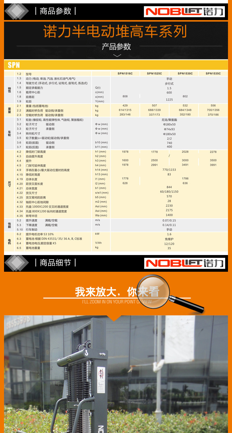 提升高度最大可达3500mm,相对于配有驱动电机的车辆提供了一种经济实惠的选择。提供了系列化的门架(1600,2500,3000,3500)和强劲的1.6KW提升电机,使其无论在堆垛或是作为工作台使用方面都是非常合适的一种多用途装卸货物的工具。