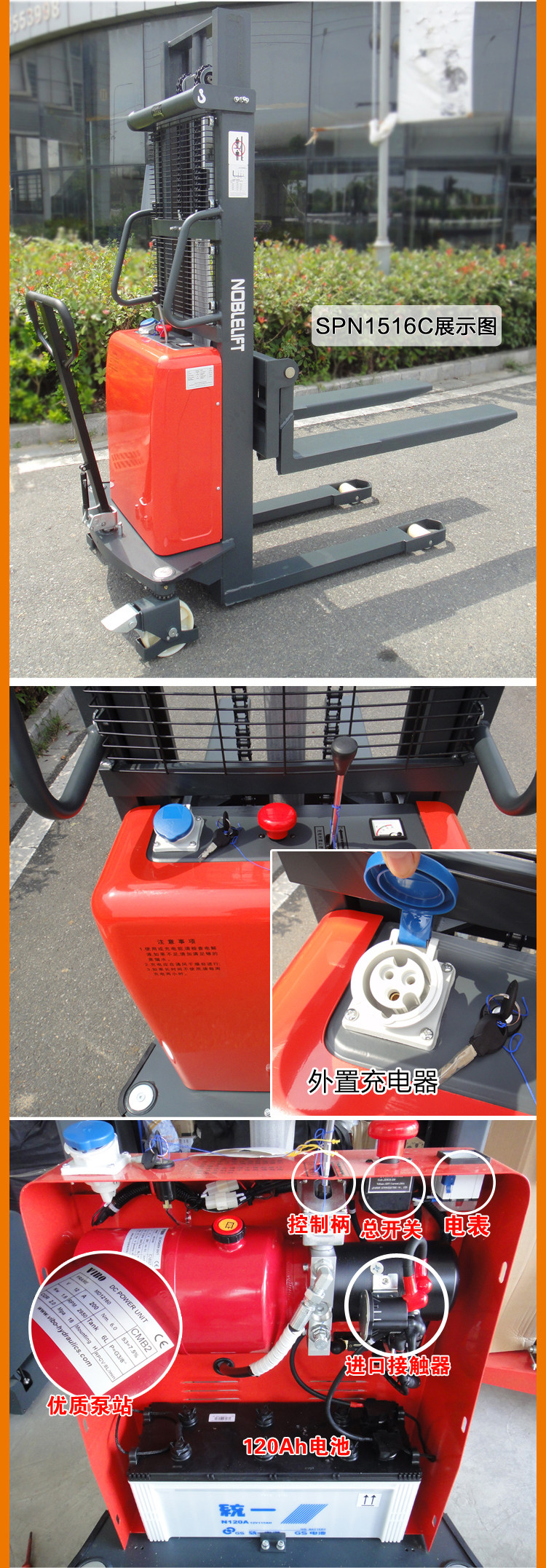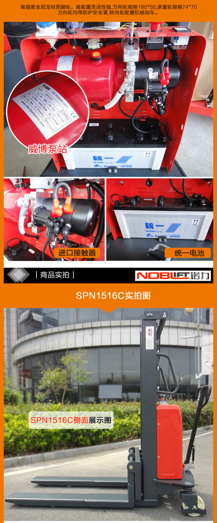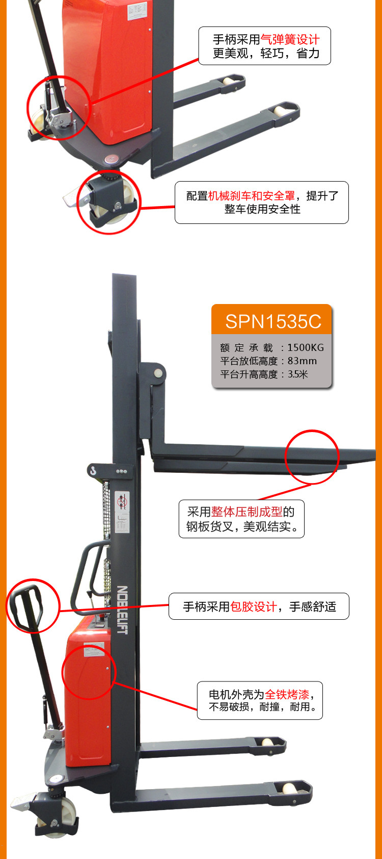 · 大功率的泵站电机缩短了起升时间,提高了工作效率,重载下降时会自动减速从而平稳放置托盘。