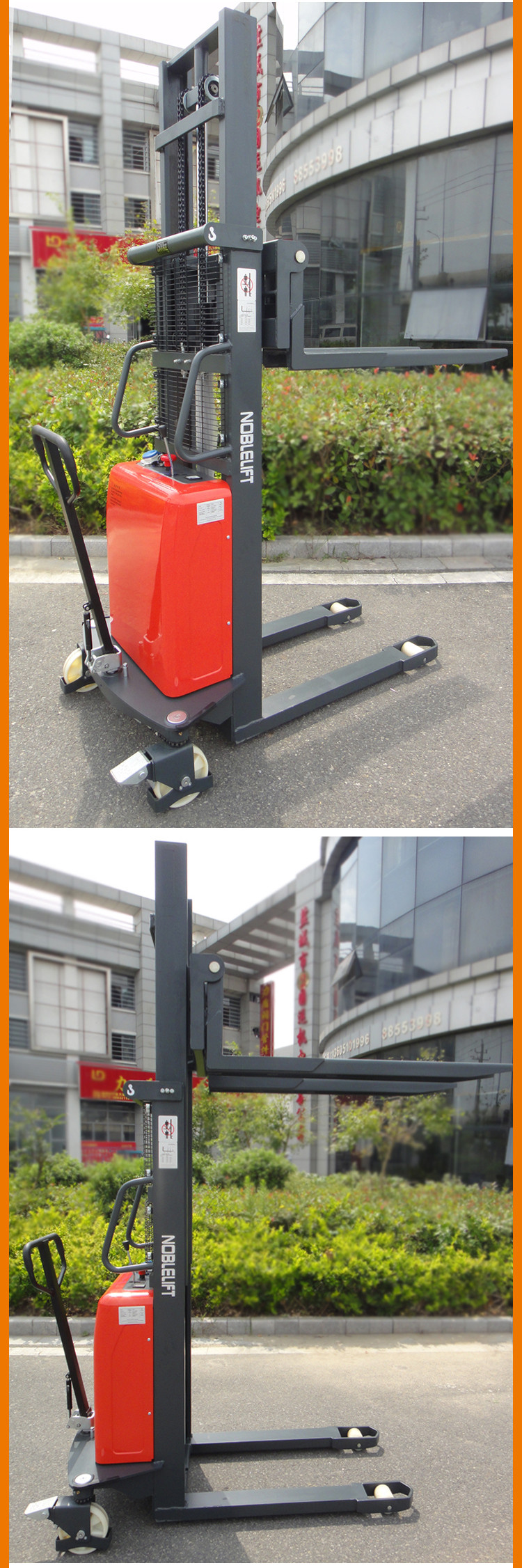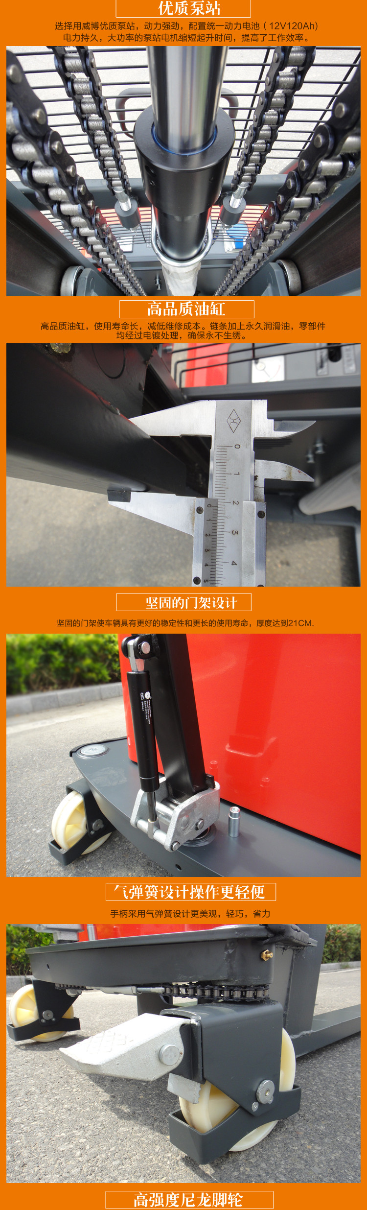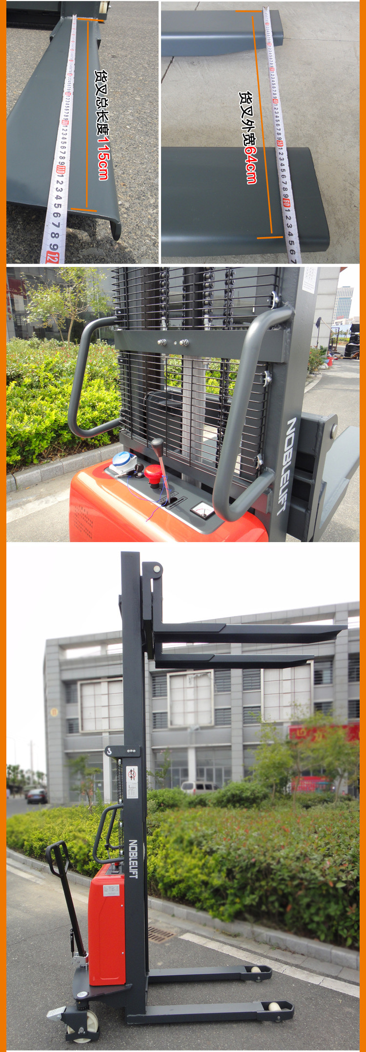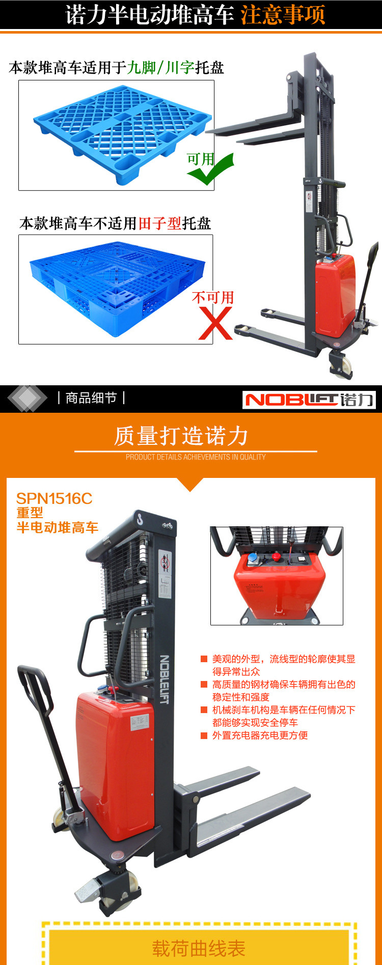 · 大功率的泵站电机缩短了起升时间,提高了工作效率,重载下降时会自动减速从而平稳放置托盘。