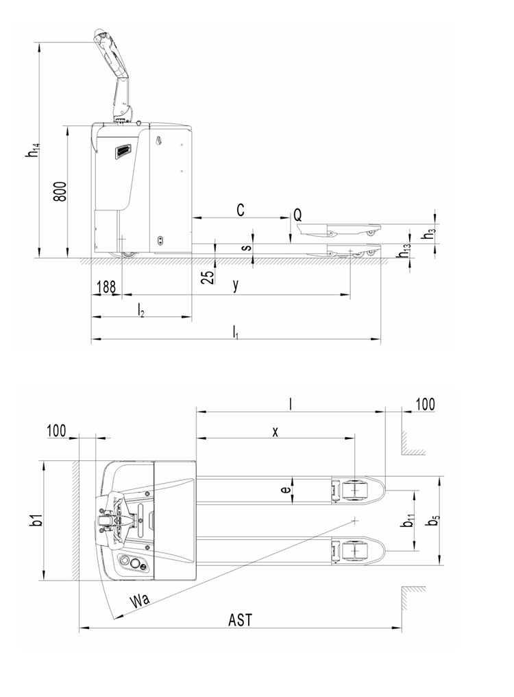 | 4.34 | 直角堆垛通道宽度,托盘800×1200(1200沿货叉放置) | Ast (mm) | 2250 | |